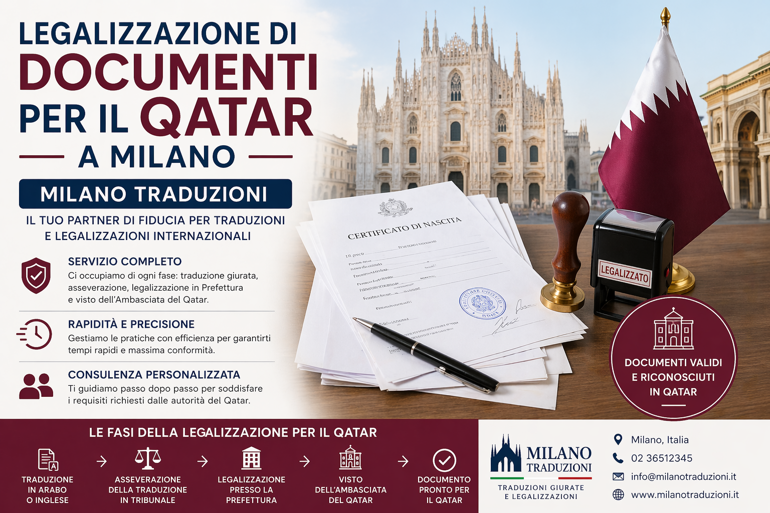 Se hai bisogno di legalizzare documenti per il Qatar a Milano, scegliere un partner affidabile fa la differenza. Contatta Milano Traduzioni per un preventivo e una consulenza dedicata: rapidità, precisione e conformità legale sono sempre garantite.